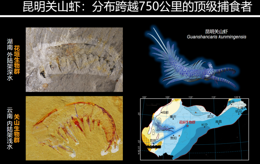这里发现了来自750公里外中国云南关山生物群占主导的奇虾类,还有加拿大布尔吉斯页岩生物群中的多种代表性动物,比如马尔虫、西德尼虫等,而那个时期的华南和北美之间被大洋隔开了相当于半个地球的距离。这些运动能力、生态类型、生活史等不同的动物在花垣生物群中的存在,表明该时期寒武纪海洋动物存在长距离跨洋扩散的机制。