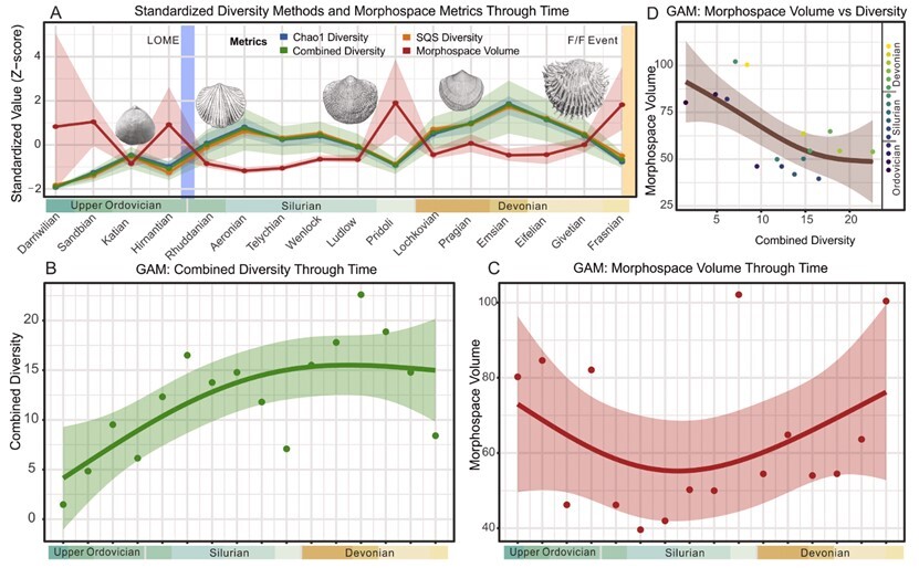 结果令人惊讶:无洞贝的多样性(物种数量)与形态差异度(演化创新能力),在大部分时间里是“脱钩”的。正是这种脱钩,把它们推向了灭绝。
