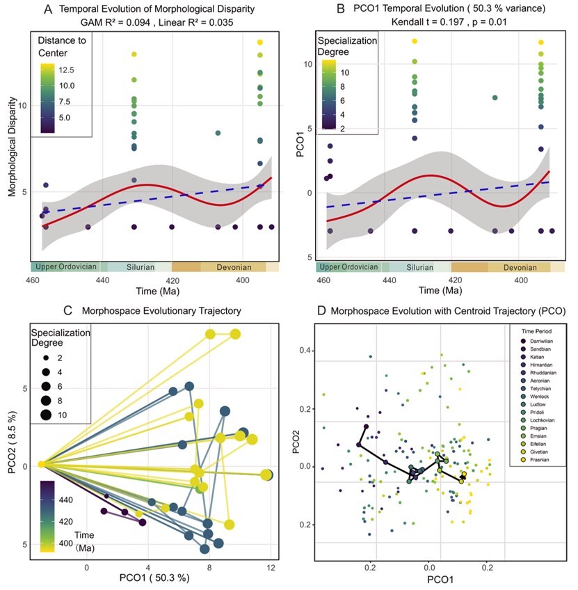 进入志留纪后,随着全球变暖与浅海环境的拓展,无洞贝迎来了分类学上的爆发,属种数量大幅攀升。然而,多样性大幅增加,形态演化却“躺平”了。这时形态地图上的点密密麻麻——看似繁荣,但仔细看,这些点挤在一起,并没有本质性的区别。
