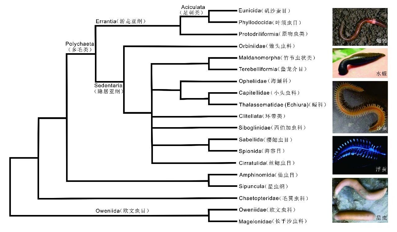 左侧为分子生物学推测的现生环节动物的内部关系,据Brusca et al. (2023)。右侧为代表性的环节动物(图片来源:作者提供)。