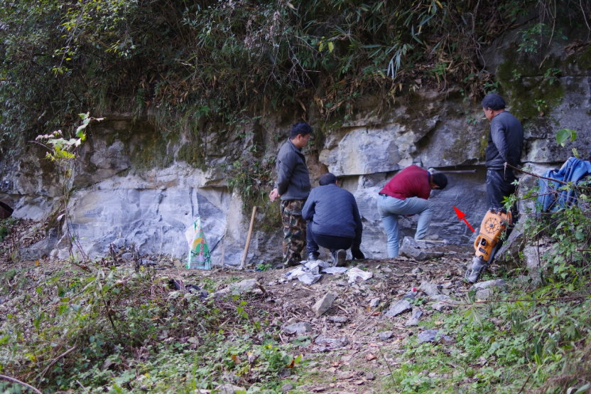 岩石样品采集现场. 箭头指向采样点. 左一为咸晓峰博士(图片来源:作者提供)