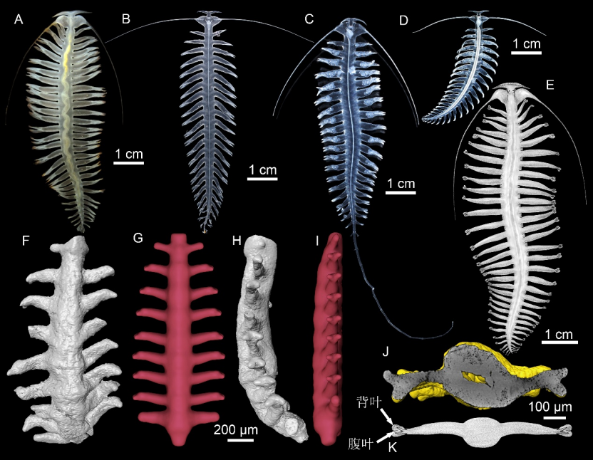 长腿张家沟虫(F–J)与现生的浮蚕类环节动物对比图(图片来源:作者提供)