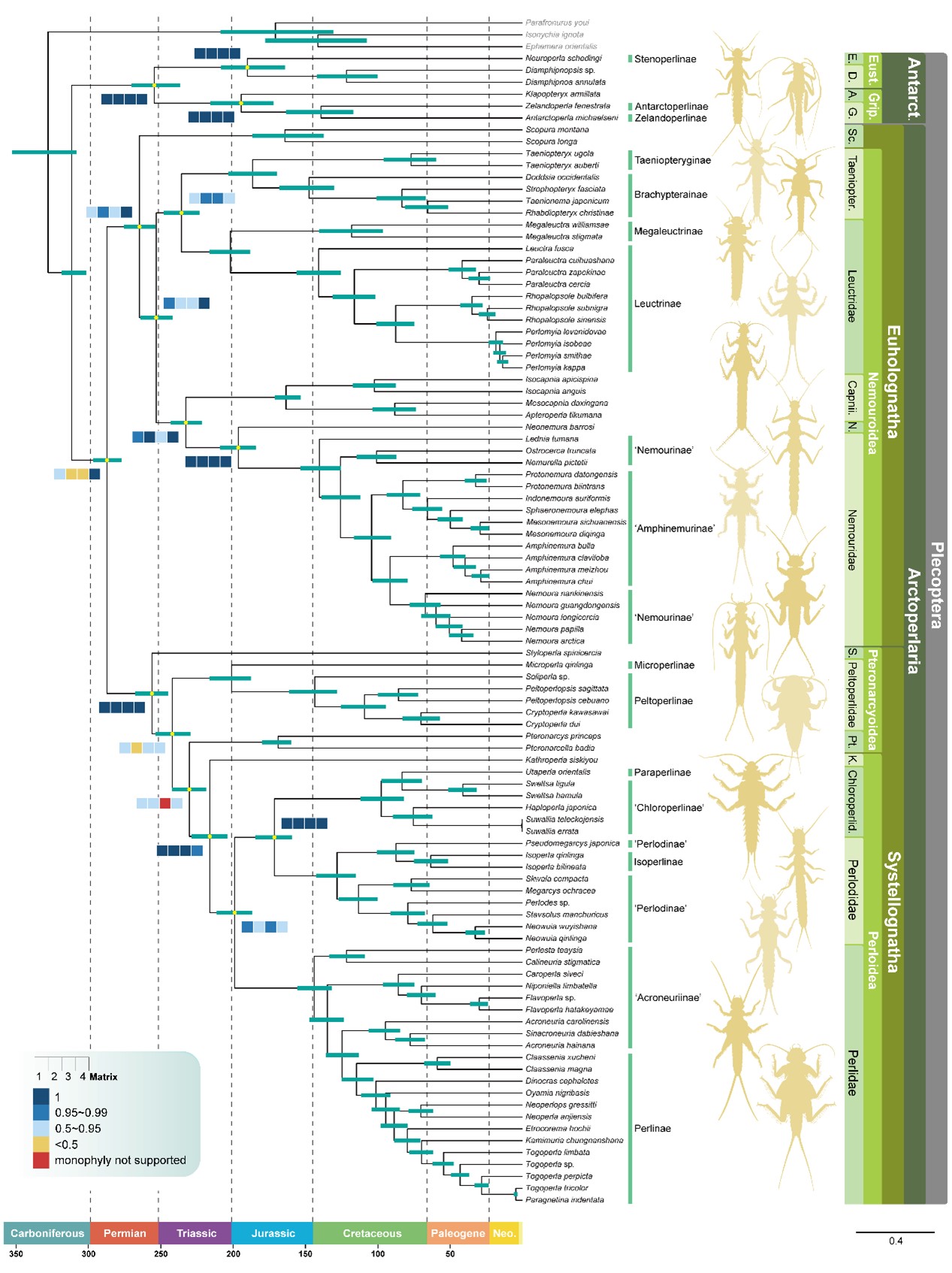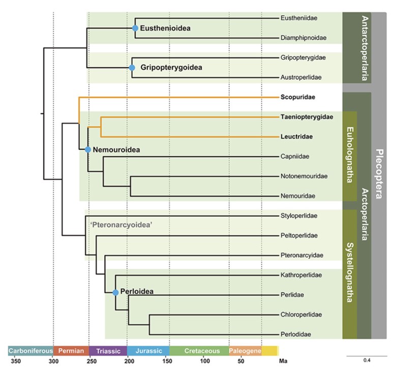 通过整合最新的的古生物学和年代地层学信息,该研究重建了石蝇的演化时间框架。结果表明,石蝇的冠群起源于宾夕法尼亚纪,其现存各科的关键分化事件主要集中在乌拉尔世至早三叠世之间。