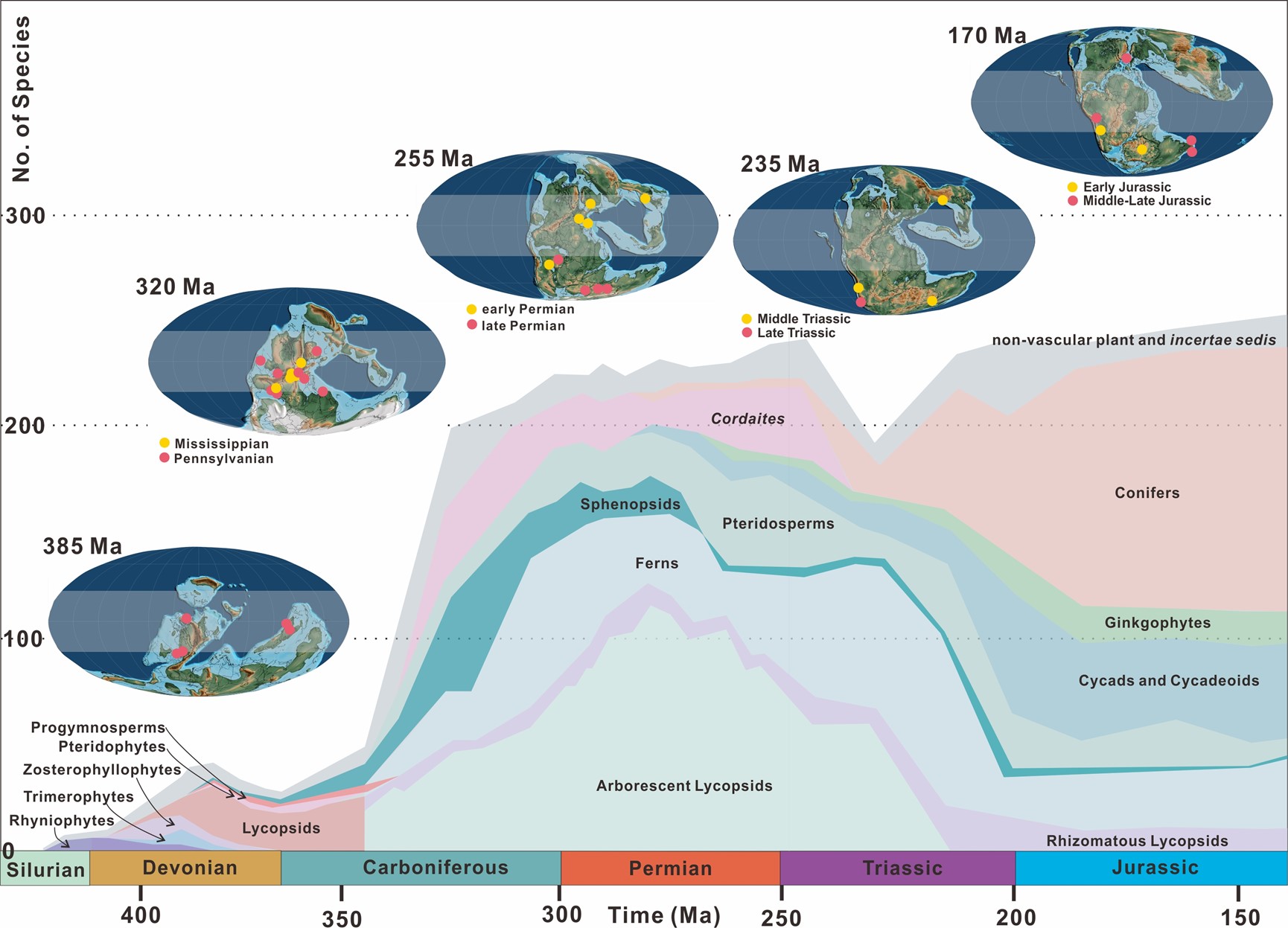 近期,中国科学院南京地质古生物研究所早期陆生植物演化研究团队博士研究生刘炳材,在徐洪河研究员指导下,联合特别研究助理王凯博士,回顾并定量评估了全球38个化石森林生态系统,数据涵盖了从中泥盆世森林起源到侏罗纪被子植物出现前,分析展示了地质历史时期森林构成、冠层高度、森林树木密度、生物量、林分结构和空间模式等生态学特征的动态变化,从现代生态学视角解析化石森林的演化,提出了泥盆纪-侏罗纪森林四阶段的演化模式,研究成果发表于地球科学领域综合期刊《地球科学评论》(Earth-Science Reviews)。