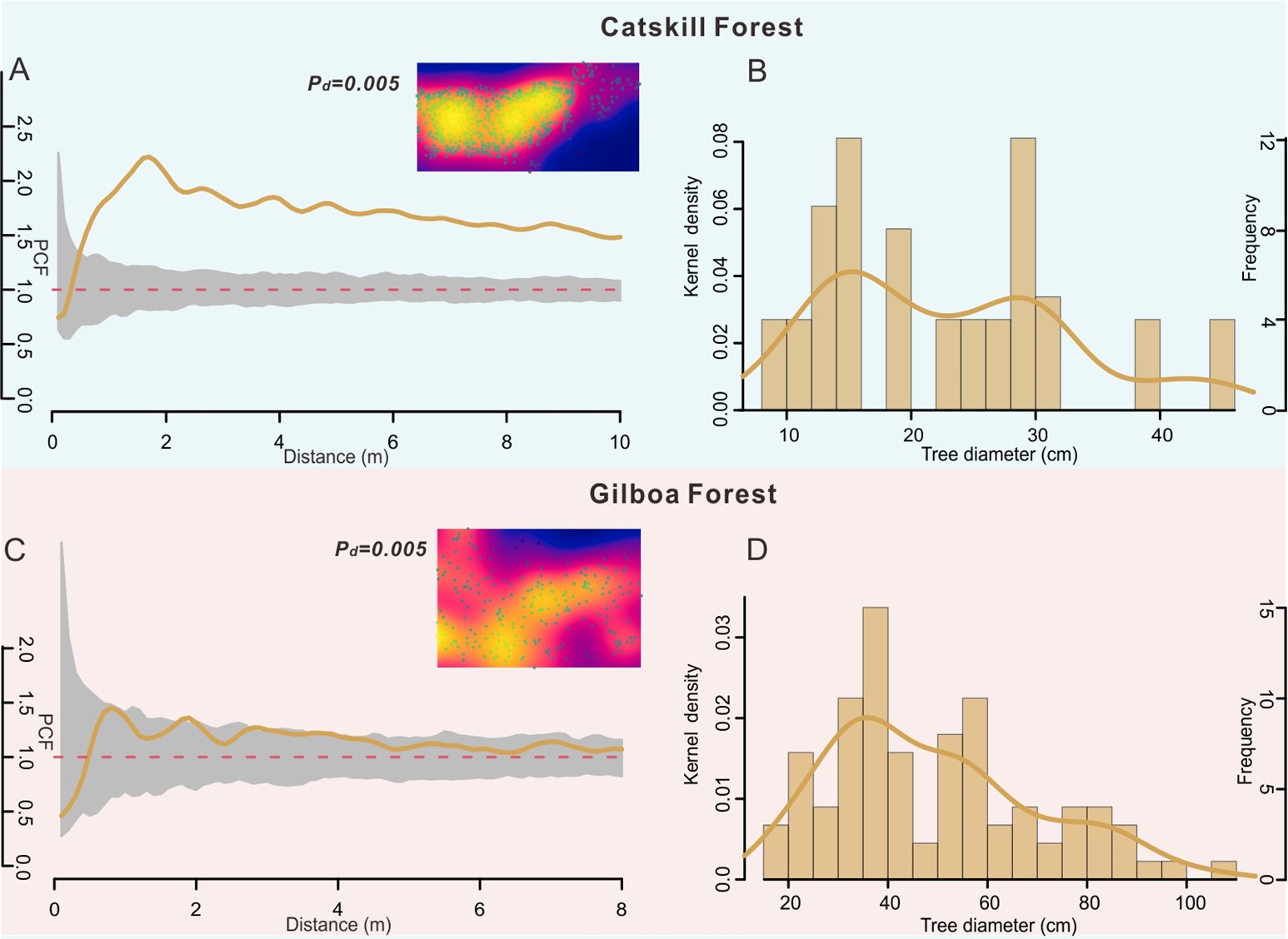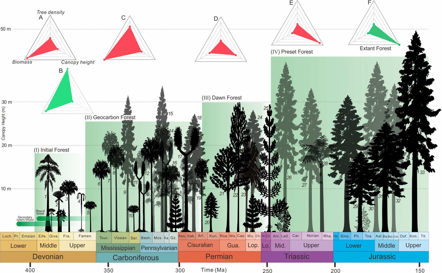 研究结果表明,泥盆纪森林主要分布在低纬度和热带地区,树蕨、石松、前裸子植物均构成森林,且表现出多样的空间模式和林分结构;石炭纪森林由石松类植物主导,生物量和树木密度达到历史峰,冠层高度超过20米;二叠纪森林扩展到中、高纬度,冠层高度增加,但生物量和树木密度有所下降;三叠纪森林主要分布在热带和温暖温带,冠层高度超过30米,生物量和树木密度与现存森林相似,且森林结构呈聚集性。侏罗纪森林扩展至干旱区域,冠层高度接近40米,生物量和树木密度与现存森林相似。空间分析表明,多数化石森林表现出聚集生长模式,类似于现代森林。从生物量来看,石松类森林的生物量最高可达到现代热带雨林生物量的12倍,且石松森林的主导时期与晚古生代大冰期吻合,可能是触发大冰期的关键因素之一。