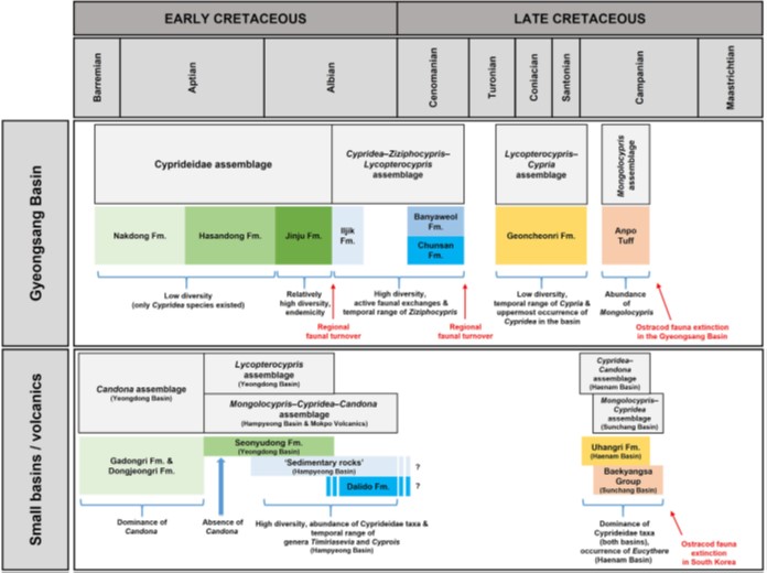 4、基于文献和新采集的材料,系统综述了韩国白垩纪介形类动物群分布及演替特征。建立了韩国白垩纪陆相盆地介形类生物地层序列,揭示了以不稳定浅水湖泊为主的古环境背景,并明确了东亚地区(特别是中-韩-蒙之间)在白垩纪中晚期存在频繁的生物交流;