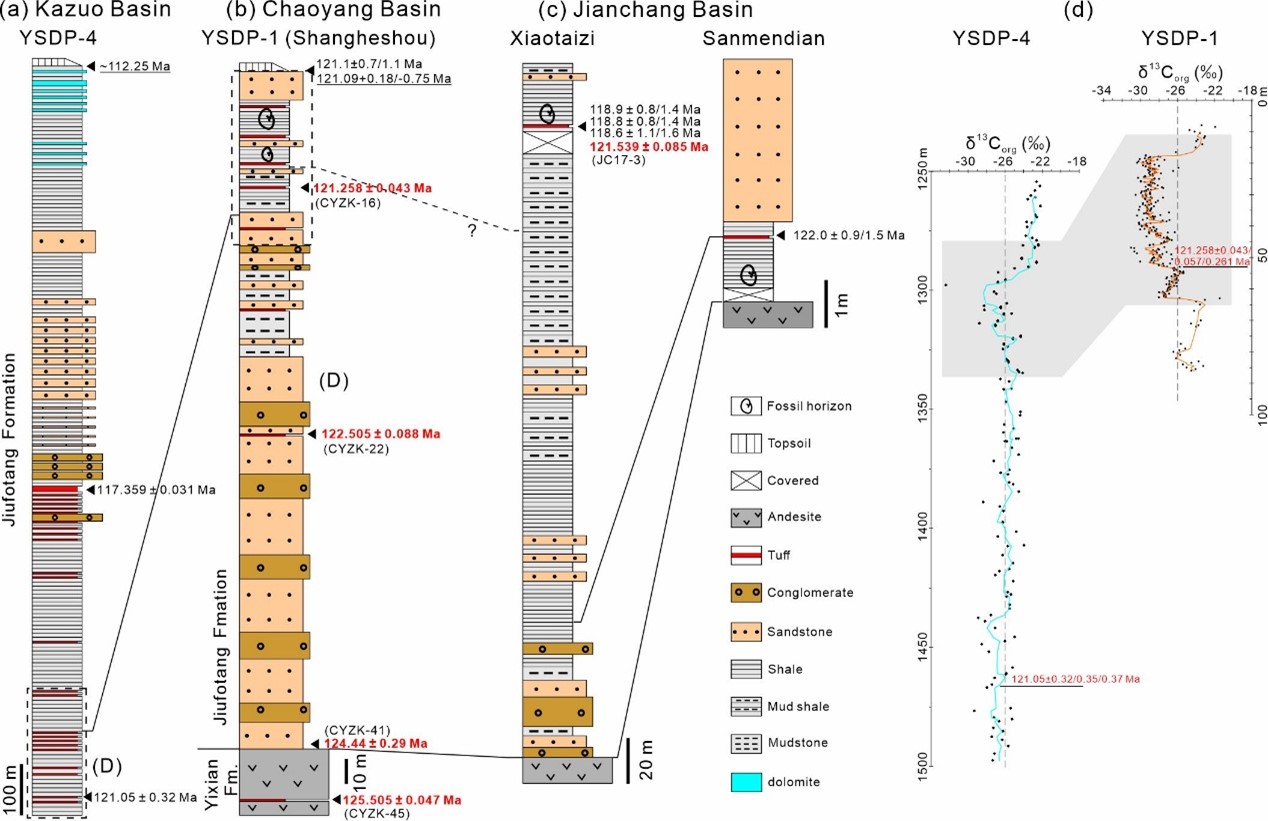 6、通过开展高精度铀-铅地质年代学(CA-ID-TIMS U-Pb)、有机碳同位素、贝叶斯年龄模型与旋回地层学的研究,明确了辽西地区九佛堂组的年代范围为124.44–112.25 Ma(early Barremian to early Aptian)(此结果与早期介形类生物地层学研究结果高度一致,参见Wang et al., 2015 Micropaleontology);而热河生物群晚期的时间跨度约为124–121 Ma,较以往认识缩短约1 Ma。