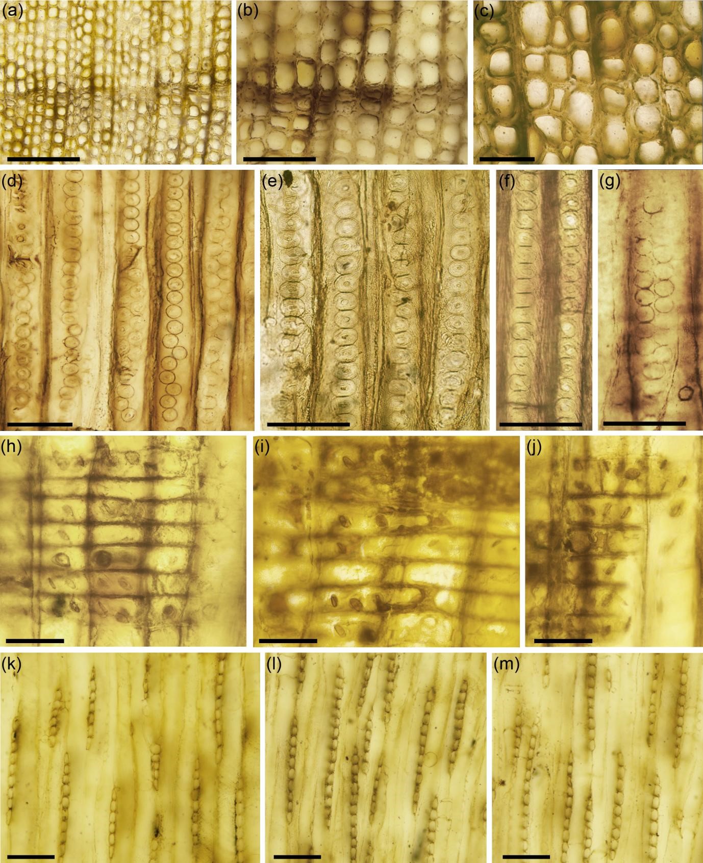 图1.辽西下白垩统义县组金刚山原始罗汉松型木(Protopodocarpoxylon jingangshanense Ding)木材化石的解剖特征(a-c为横切面、d-j为径切面,k-m为旋切面)