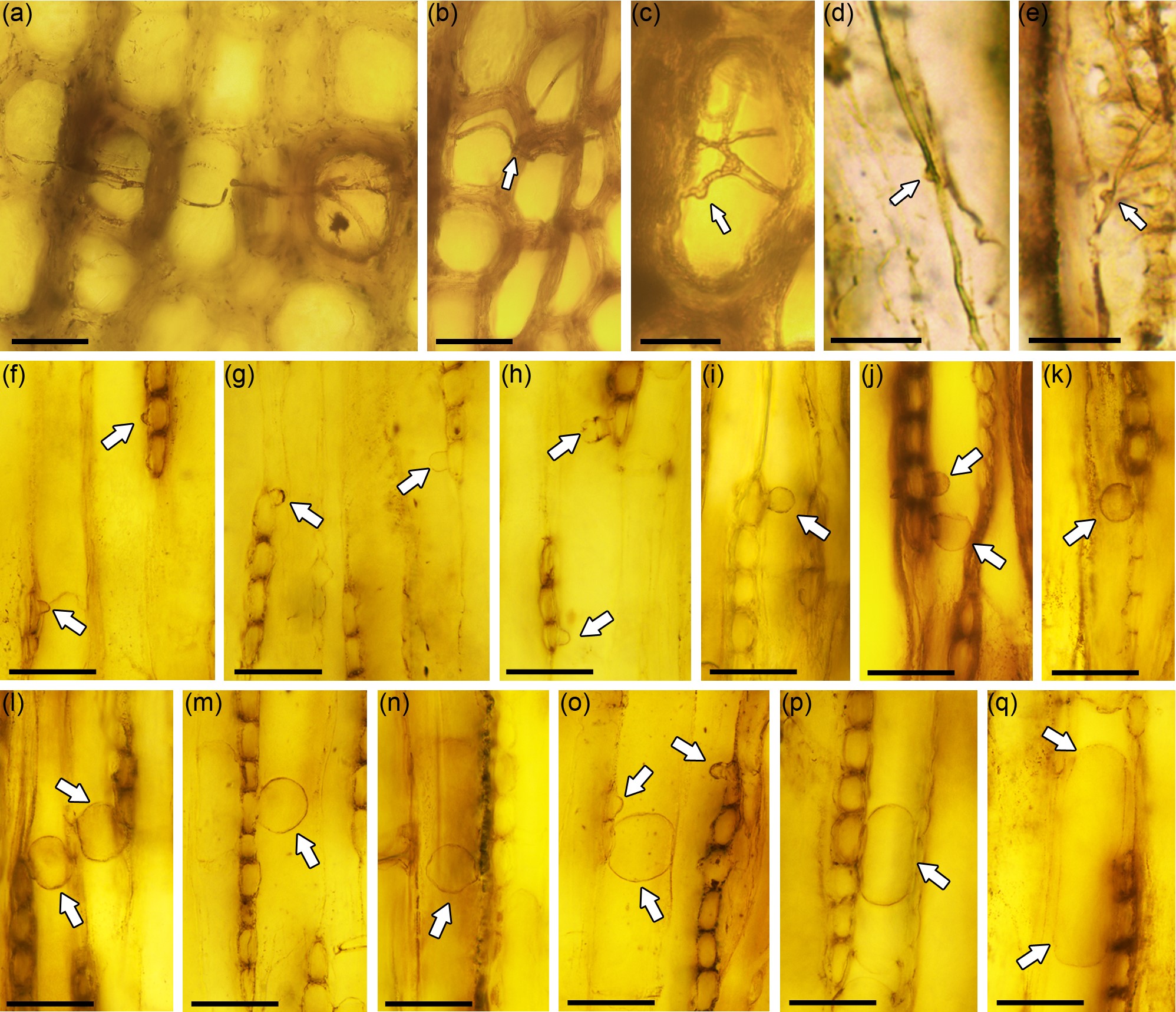 图2. 木化石内含真菌菌丝化石(a-e)及不同发育阶段的侵填体化石(f-q)