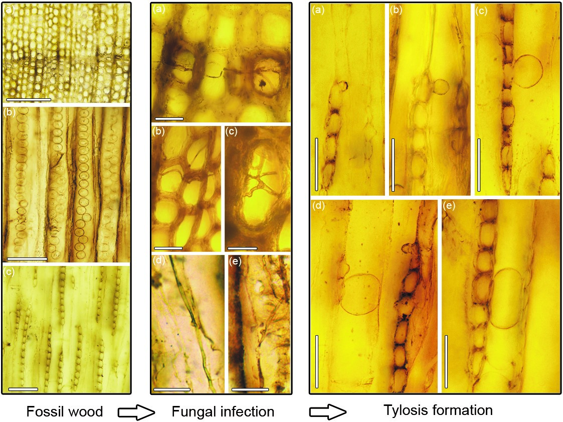这是该团队今年在辽西侏罗纪木化石中发现最古老蓝变真菌化石之后(发表在National Science Review),在中生代木材真菌化石领域的又一项重要研究进展。本研究发现的担子菌门真菌寄生罗汉松科植物的化石,表明 1.2 亿年前就存在这种寄生关系,为研究当时植物与真菌的相互作用提供了直接证据,有助于了解植物的防御机制和真菌寄生策略的演化。该发现不仅是热河生物群首次发现的真菌化石记录,也是白垩纪首例真菌化石与侵填体共存的证据,填补了侏罗纪与新生代之间相关记录的空白。本研究也表明,真菌化石在白垩纪陆地生态系统中的扮演着重要的角色,提供了白垩纪木材对寄生真菌产生生理防御响应的可靠证据,深化了对早白垩世陆地生态系统中植物-真菌相互作用的认识。