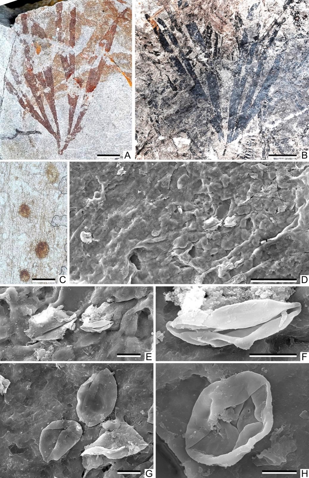 图3. 优雅拜拉(Baiera concinna)代表性叶片标本及角质层结构、分散花粉