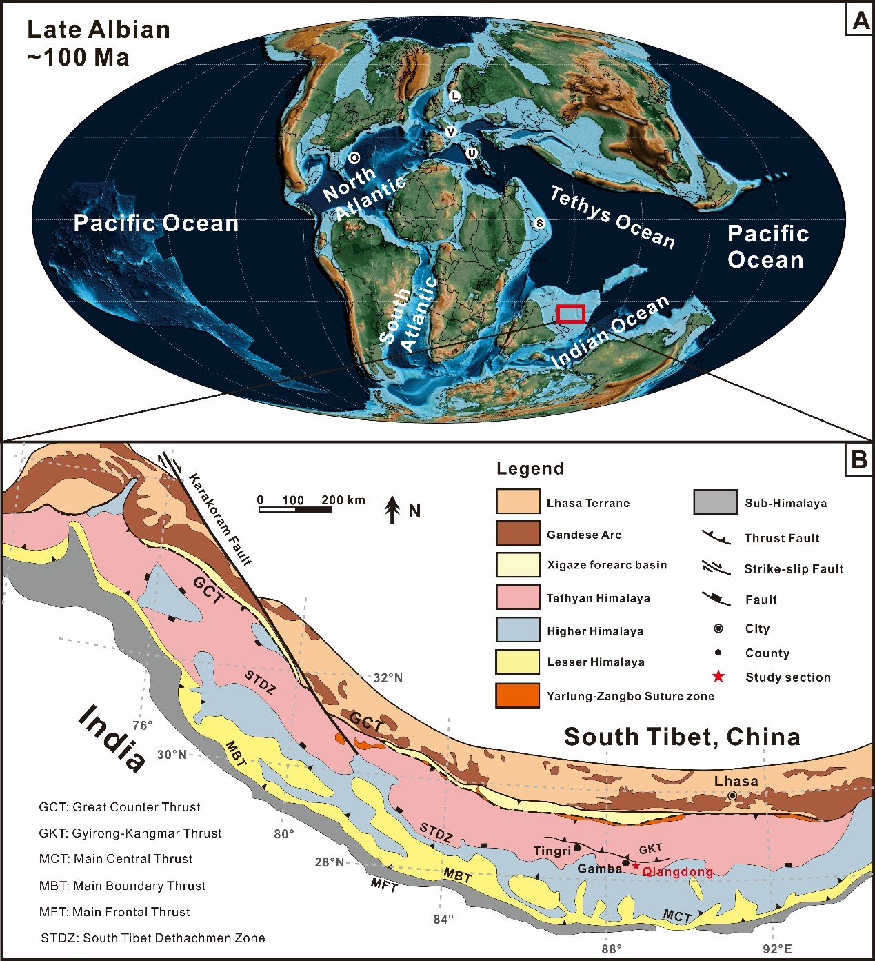 (A) Albian晚期(~100 Ma)古地理图; (B)藏南强东剖面地质简图