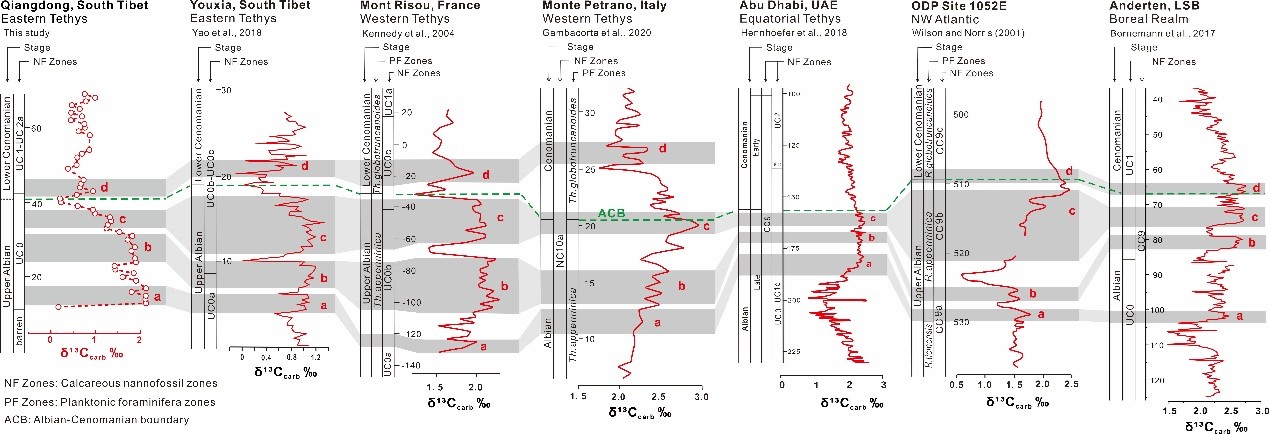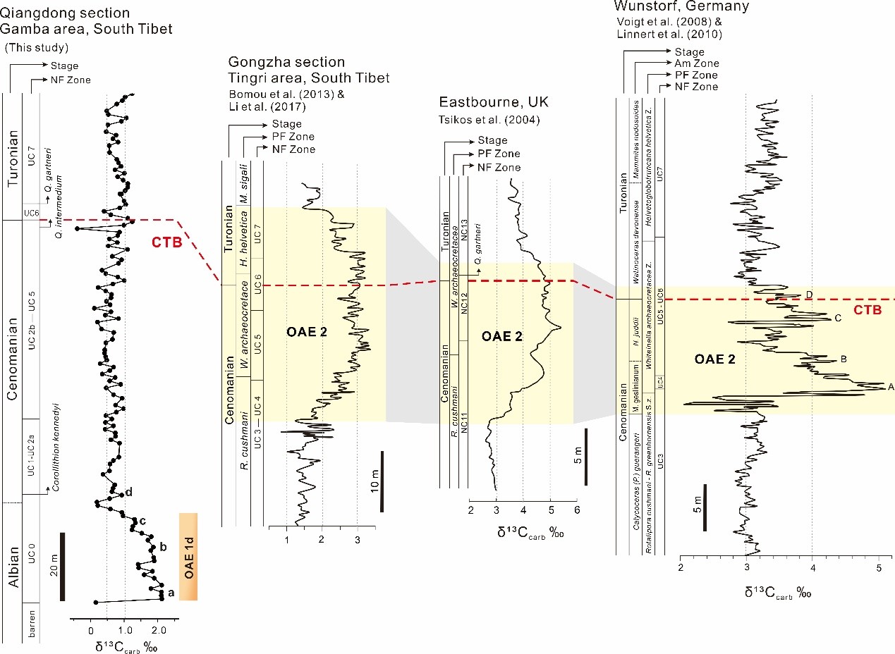 此研究在藏南岗巴地区强东剖面建立了Albian晚期至Turonian早期的连续碳、氧稳定同位素记录,并系统评估了成岩作用对碳同位素信号的影响。高分辨率δ13Ccarb 记录在钙质超微化石UC0带内识别出~1.5‰的碳同位素正异常,首次在该区识别出OAE 1d,并实现了与全球多个古海洋区域的精细对比。极低的δ18Ocarb值、碳氧同位素的协变关系、富含伊利石的黏土矿物组合、Tmax(432–560°C)与TAI指标以及钙质超微化石的选择性溶解特征共同表明,强东剖面整体经历了显著的埋藏成岩和热改造过程,且在碎屑输入增强、碳酸盐含量较低的层段中,碳同位素更易受到成岩作用的影响。