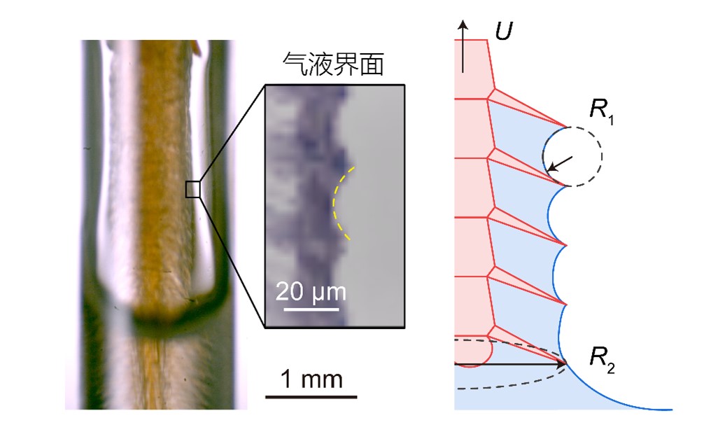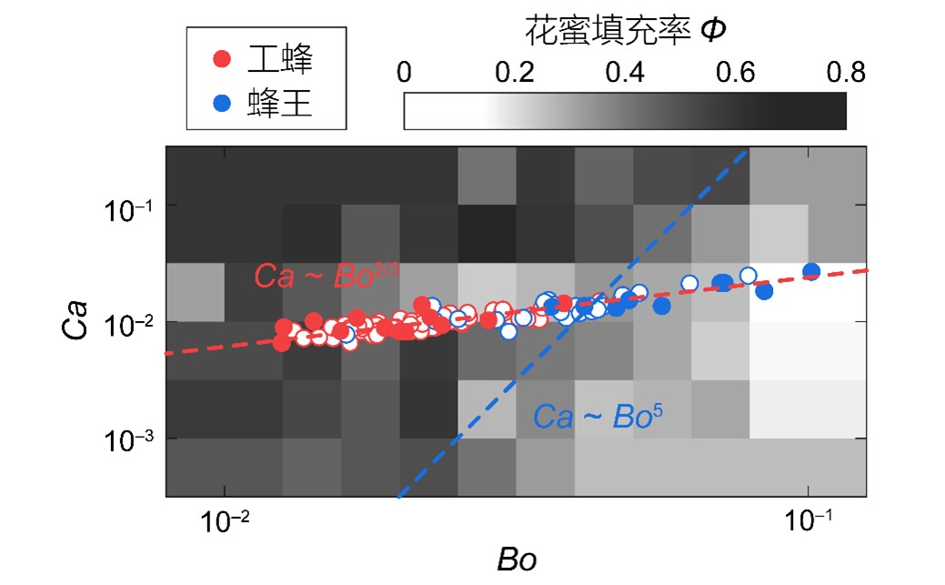 研究团队基于显微高速成像技术发现,中唇舌回撤时,相邻刚毛形成弯曲的气液界面,这些界面提供了一个额外的毛细压力梯度,增强了粘性花蜜的夹带。这个额外的毛细压力用来平衡液体静压,当刚毛间距变宽或中唇舌长度变长,都会导致中唇舌的液体承载能力下降。除了液体的表面张力,液体的粘度也对花蜜的捕获起到了作用。研究通过引入两个无量纲数:邦德数和毛细数,可以衡量这一液体输运过程中重力、毛细力、粘性力的相互作用。为了使花蜜尽可能多的填充满中唇舌的可用空间,系统应该工作在低邦德数,高毛细数的区域。为了维持较高的花蜜填充率,邦德数和毛细数应该满足特殊的标度关系。然而由于中唇舌结构的生长限制,自然环境下当熊蜂体型增大时,熊蜂口器无法满足最优的标度关系,重力将起主导作用,从而降低花蜜的填充率。