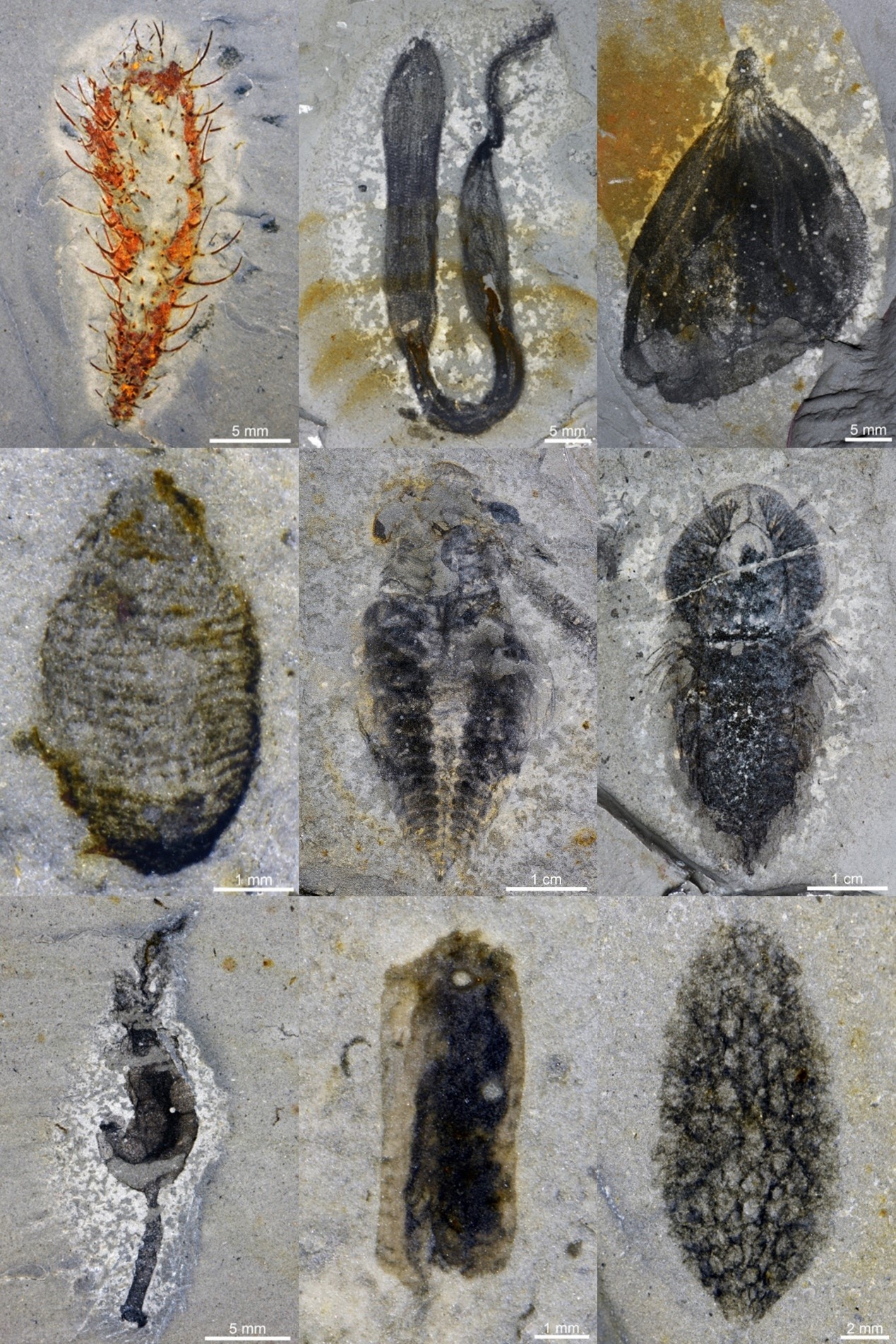 (1)花垣生物群的化石数量丰富、多样性高、保存精美:花垣生物群的化石主要产出于深约12米、长约30米、宽8米的仁枯坡采坑,目前累计采集到的化石标本超过5万多块。研究团队从早期阶段采集的8681件动物化石个体中识别出了153个动物物种,其中59%代表了新物种。花垣生物群仁枯坡采坑的物种多样性超过了澄江动物群、布尔吉斯页岩生物群等单一采坑产出的物种数。同时,花垣生物群展现出很高的门类多样性,涵盖了非两侧对称动物中的多孔动物、开腔骨动物、栉水母动物、刺胞动物,原口动物中的曳鳃动物、叶足动物、节肢动物、毛颚动物、环节动物、腕足动物、软体动物、软舌螺动物,后口动物中的古虫动物、棘皮动物、半索动物、脊索动物,共16个门一级动物类群。花垣生物群属于典型的布尔吉斯页岩型化石群,化石主要以碳质膜和黏土矿物膜形式保存。既保存了包括奇虾类在内的完整动物个体,又保存了柱头虫等多种全身软体的动物,同时展现出高保真度的软躯体生物学结构,比如肠道、消化腺等组成的消化系统,视神经、腹神经索在内的神经组织,以鳃为代表的呼吸器官等等。