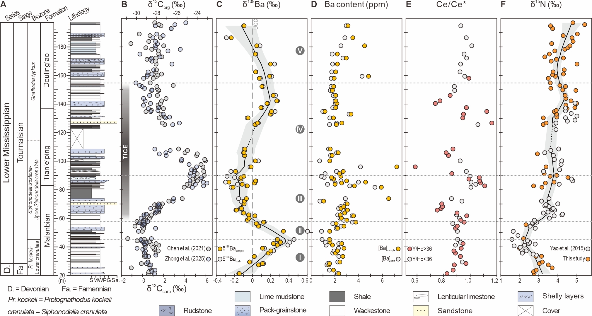 浅水碳酸盐岩是记录古海水钡同位素的理想材料。在对地史时期重大事件的研究中,碳酸盐岩钡同位素(δ138Bacarb)常被用于示踪海洋初级生产力提高和浅海缺氧扩张。近期,中国科学院南京地质古生物研究所晚古生代团队博士生仲钰天在研究员陈吉涛的指导下,联合团队研究员郄文昆、助理研究员高彪和博士生杨文莉,对华南马栏边剖面下石炭统杜内阶碳酸盐岩地层开展了高分辨率的δ138Bacarb和区域氧化还原指标(铈异常、氮同位素、微量元素)的测试工作,并结合δ138Bacarb跨区域对比以及其他地球化学记录的佐证,厘清了该时期海洋碳-钡循环过程,论证了海洋初级生产力在这一关键气候转换期的重要作用。相关成果发表于国际知名NI期刊《地球化学与宇宙化学学报》(Geochimica et Cosmochimica Acta)。