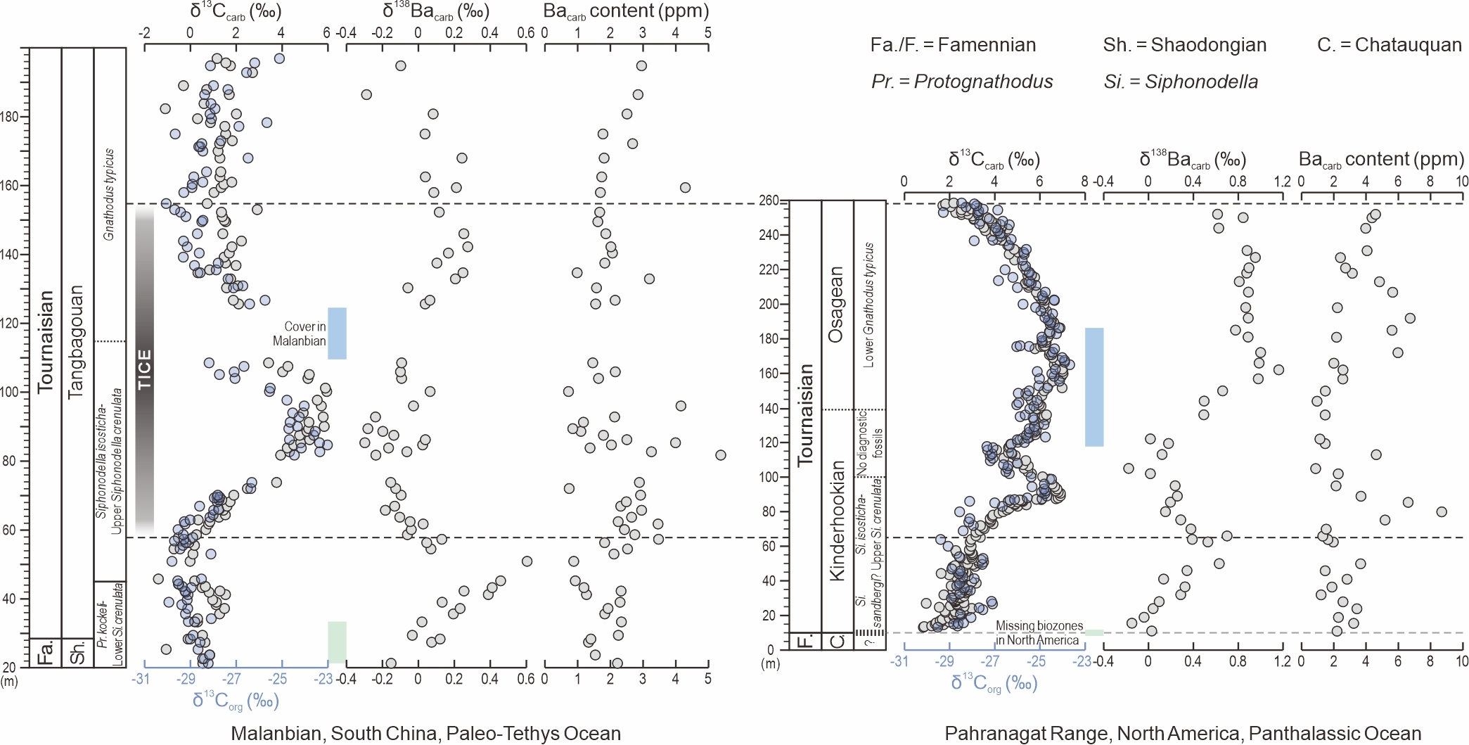 同时,该研究发现海洋初级生产力的变化显著早于TICE碳同位素记录的大幅度波动(即TICE的启动)。生产力的提高增加了海洋有机质的生产和海水溶解氧的消耗,为TICE的启动提供了充要条件。海洋碳-钡循环在TICE第一幕期间受控于极高的初级生产力水平和由生产力诱发的严重的海洋缺氧,而在第二幕期间则由海洋初级生产力主导,仅在局域上受到氧化还原条件的有限影响。海洋初级生产力自泥盆纪-石炭纪界线附近开始提高,至TICE事件结束暂缓,深刻地影响着全球碳循环和气候与环境变化,推动了晚古生代变冷的进程。在地球历史关键气候转折期的研究中,海洋初级生产力的重建始终是前沿研究热点之一,通过研究发现,δ138Bacarb可以作为一个可靠的示踪指标。