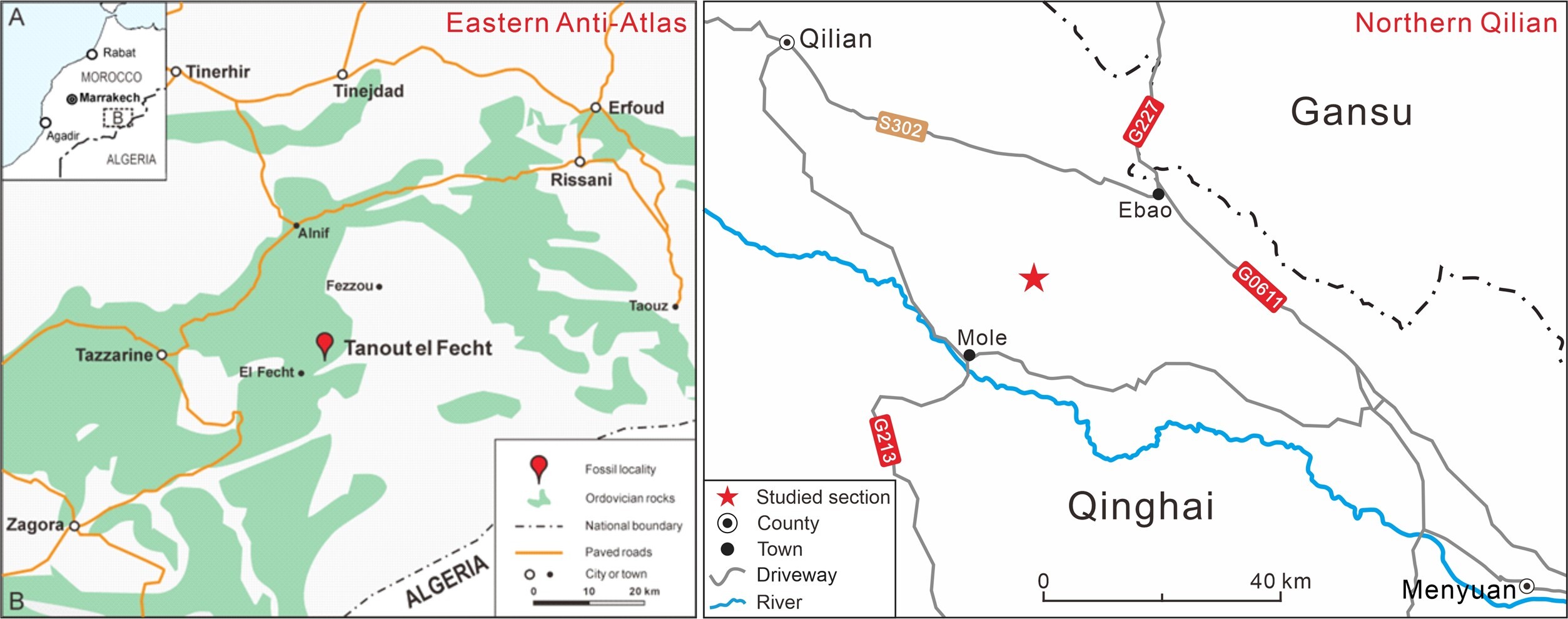 研究区域地理位置和化石产地图(左:摩洛哥小阿特拉斯山脉;右:祁连山地区)