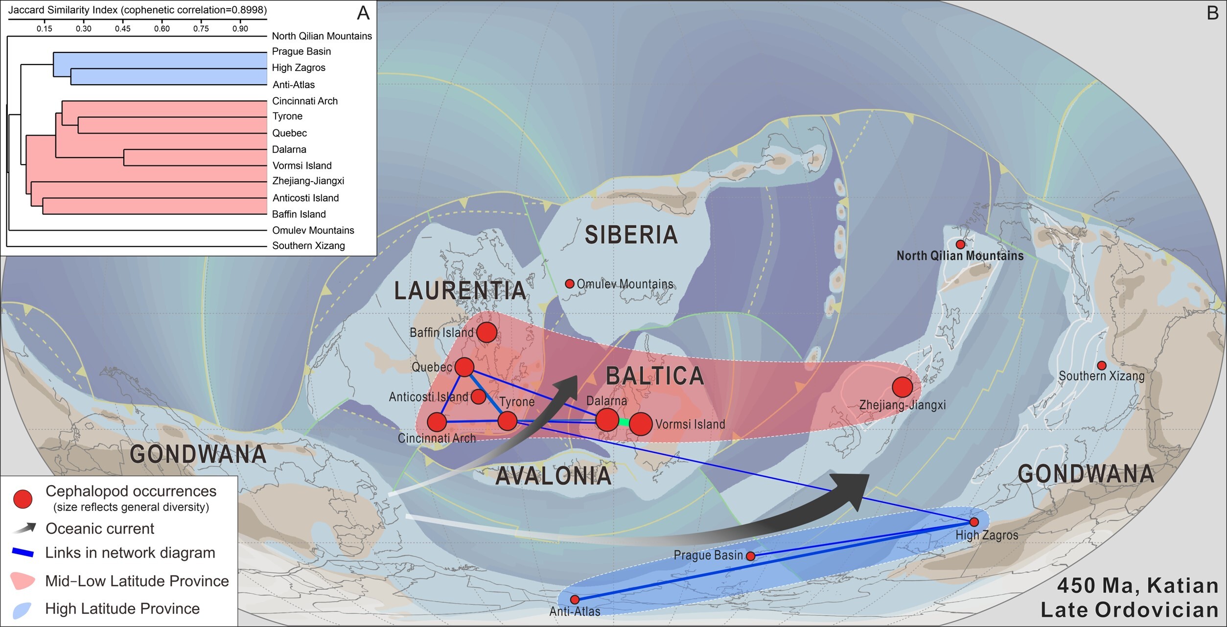 Ⅲ. 研究还借助PAST和EDENetworks等手段开展了聚类分析和加权网络分析。分析结果识别出凯迪中期的两个头足类生物区:以劳伦和波罗的为主的中–低纬度生物区、以冈瓦纳大陆周缘为主的高纬度生物区,全球性的洋流或许驱动了上述头足类生物区的形成与分布。