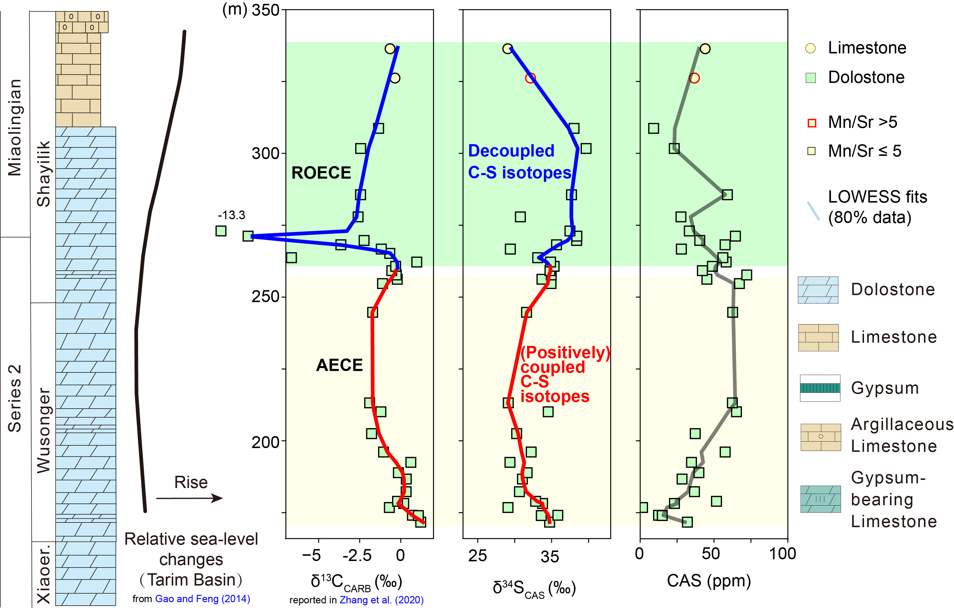 本研究通过对塔里木盆地的肖尔布拉克剖面开展系统的碳酸盐岩采样,获得了ROECE事件前后的碳酸盐岩微量硫酸盐(CAS)的硫同位素新数据(δ34SCAS)。研究发现,在ROECE事件发生前,海水碳、硫同位素呈现显著的正相关耦合特征;然而,在ROECE事件期间,碳、硫同位素表现为明显的“解耦”现象:即碳同位素发生剧烈负偏,而硫同位素则显著正偏(图1)。