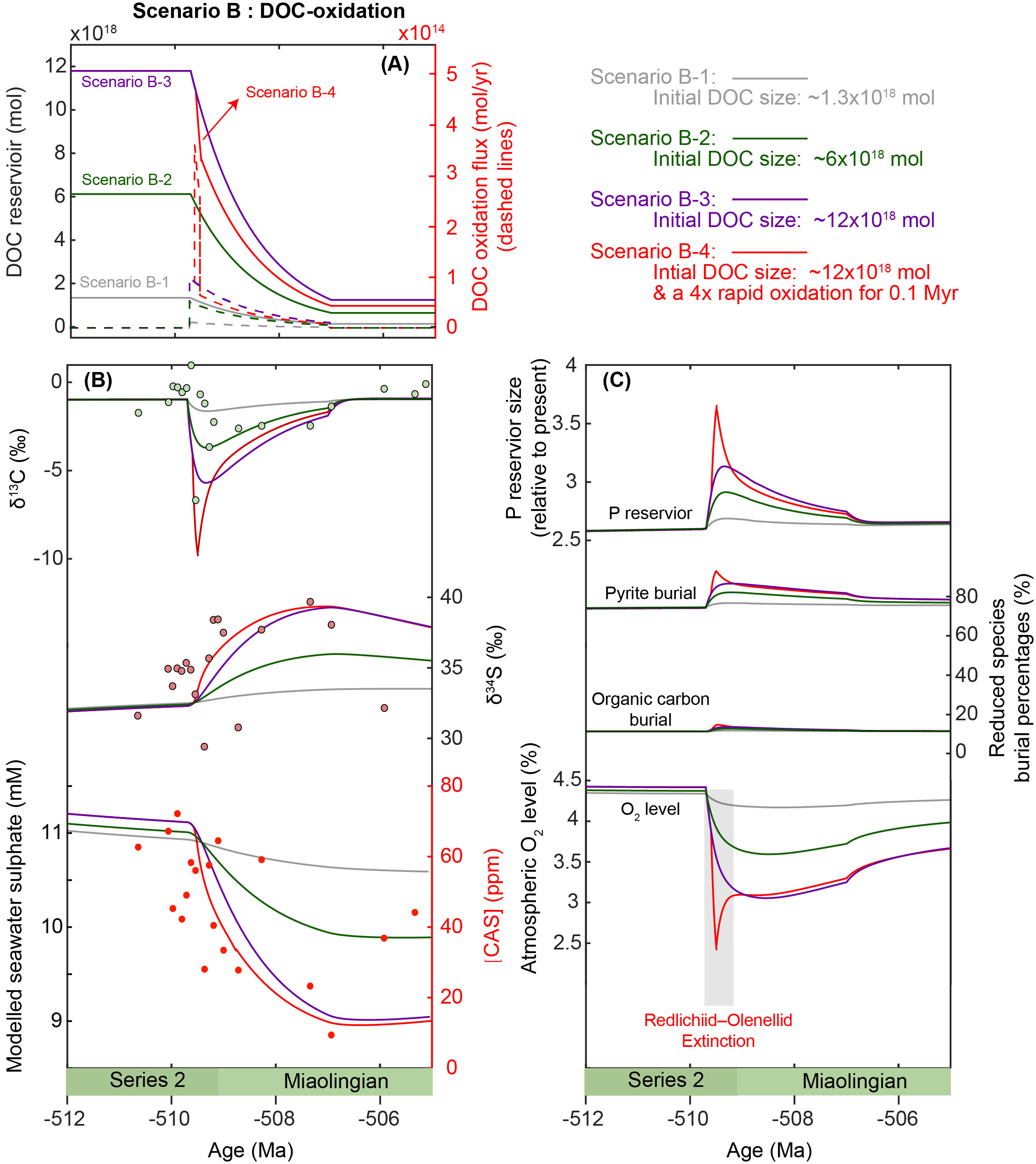 为了定量评价这一异常特征的成因,研究团队利用COPSE生物地球化学箱式模型开展了数值模拟工作。模拟结果显示,大火成岩省释放的轻碳(以及初级生产力变化或者碳酸盐岩风化强度变化等假说)无法解释碳同位素负偏和硫同位素正偏的同步发生。相反,“底层缺氧水体上涌”模型可以复现ROECE事件期间的海水碳-硫同位素特征:寒武纪缺氧水体很可能富含溶解有机碳(DOC),在全球大规模海侵过程中,缺氧水体的上涌,导致DOC与氧气接触被氧化,贡献了大量的负碳信号;同时,随着DOC氧化消耗氧气,水体缺氧程度增加、硫酸盐还原作用增强,黄铁矿埋藏量显著增加,导致海水的硫同位素正偏(图2)。
