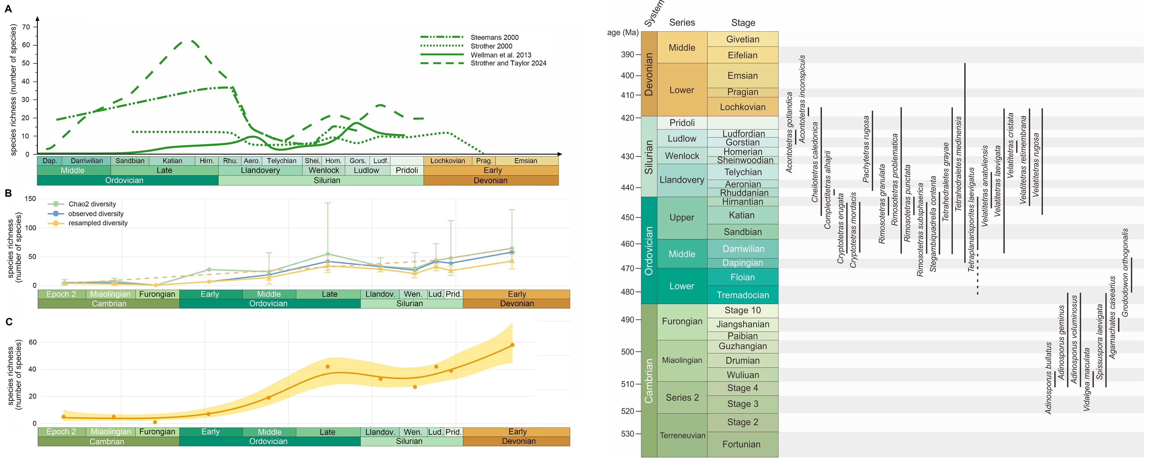 隐孢子的多样性变化曲线(图左)和地层延限分布(图右)