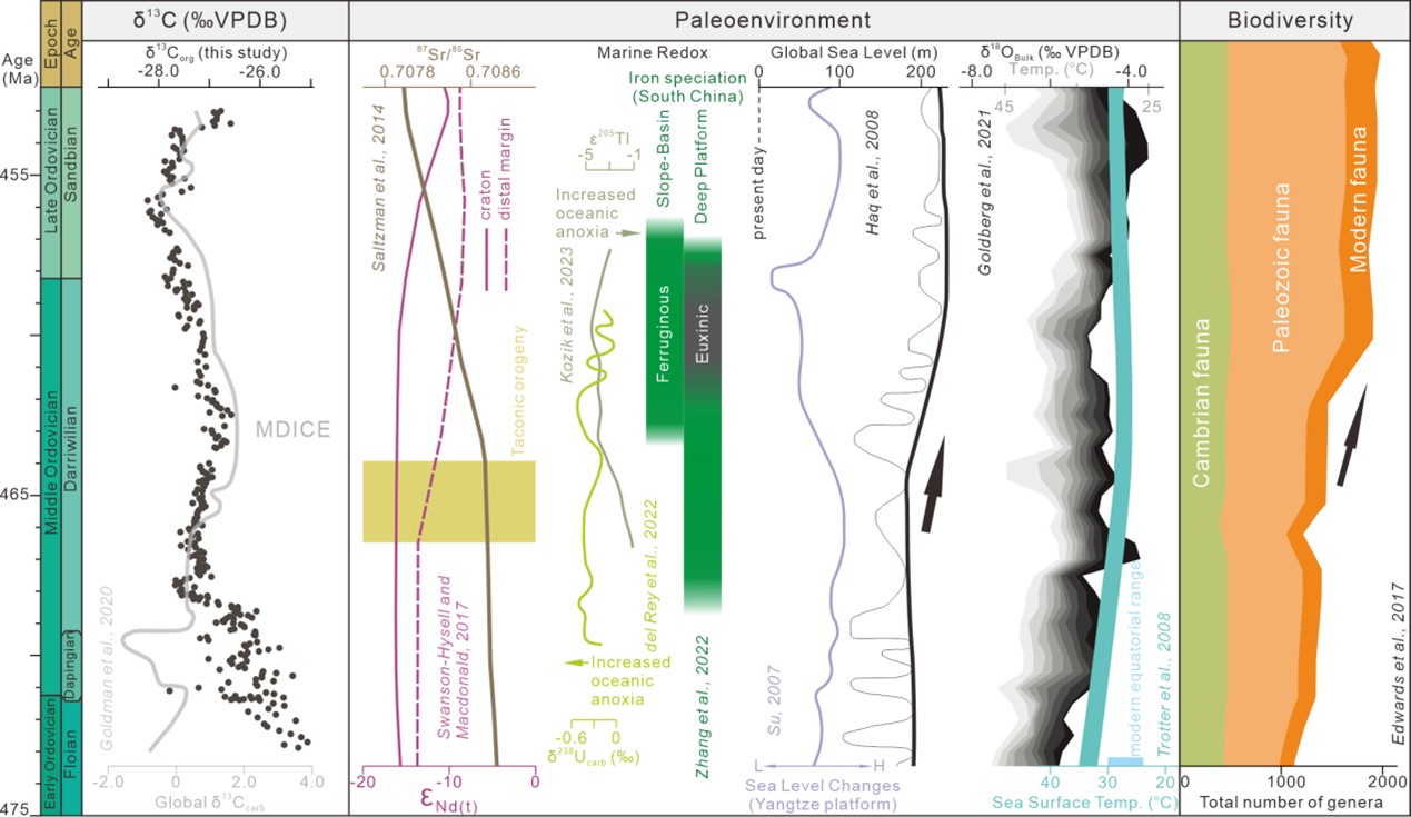 近期,中国科学院南京地质古生物研究所副研究员王亚琼联合韩国大邱自然馆高级研究员Byung-Do Choi、中国科学院广州地球化学研究所副研究员钟玉婷以及南京大学教授泮燕红等国内外科研人员,基于陆相介形类化石生物地层学及高精度定年,对东亚多个陆相沉积盆地的白垩纪地层序列和时代框架取得了系统性研究进展。白垩纪是地球历史上典型的“温室”时期,其陆相记录对理解现代全球变化具有重要参考价值。东亚作为当时最大的陆块,发育了完整的白垩纪陆相地层序列,保存了丰富的化石记录,为研究温室背景下陆地生态系统演化与重大地质事件的关系提供了重要材料。而这一切研究的基础,在于建立高精度的地层层序与时间框架。近期,中国科学院南京地质古生物研究所副研究员王亚琼联合韩国大邱自然馆高级研究员Byung-Do Choi、中国科学院广州地球化学研究所副研究员钟玉婷以及南京大学教授泮燕红等国内外科研人员,基于陆相介形类化石生物地层学及高精度定年,对东亚多个陆相沉积盆地的白垩纪地层序列和时代框架取得了系统性研究进展。具体研究进展:1、报道了吉林白山盆地小南沟组介形类动物群,通过介形类生物地层学研究,明确了小南沟组的沉积时代为早阿尔布期(early Albian);2、对平凉地区六盘山群介形类化石进行了重新梳理,利用介形类生物地层学对比明确李洼峡组的时代阿普第期—阿尔布期(Aptian-Albian),马东山组的时代为阿尔布阶(Albian),显著缩短六盘山群整体沉积时限;3、对鄂尔多斯盆地泾川组介形类化石展开了系统古生物学和生物地层学研究,明确了泾川组的地质年代为阿普特期(Aptian);这为进一步探讨白垩纪副热带的时空分布特征提供了可靠的“时间”数据;4、基于文献和新采集的材料,系统综述了韩国白垩纪介形类动物群分布及演替特征。建立了韩国白垩纪陆相盆地介形类生物地层序列,揭示了以不稳定浅水湖泊为主的古环境背景,并明确了东亚地区(特别是中-韩-蒙之间)在白垩纪中晚期存在频繁的生物交流;5、对韩国庆尚盆地Banyaweol组和Geoncheonri组介形类化石的再研究表明,在晚白垩世早期,该地区介形动物群就与东亚其他地区(尤其是中国)存在广泛的生物交流;这一研究成果也为揭示整个白垩纪中晚期东亚地区陆相介形类动物群的演替特征提供了新线索;6、通过开展高精度铀-铅地质年代学(CA-ID-TIMS U-Pb)、有机碳同位素、贝叶斯年龄模型与旋回地层学的研究,明确了辽西地区九佛堂组的年代范围为124.44–112.25 Ma(early Barremian to early Aptian)(此结果与早期介形类生物地层学研究结果高度一致,参见Wang et al., 2015 Micropaleontology);而热河生物群晚期的时间跨度约为124–121 Ma,较以往认识缩短约1 Ma。以上研究显著提升了东亚白垩纪陆相地层研究的精度和可靠性,为更深入理解白垩纪陆地生态系统的演变历程以及东亚与全球古地理、古气候事件的关联提供了至关重要的时间标尺和地层学依据。相关研究得到国家自然科学基金委基础中心项目、面上项目和中韩合作交流项目的联合支持。论文相关信息:1. Yaqiong Wang*, 2025. First report of the non-marine ostracod fauna from the Lower Cretaceous Xiaonangou Formation of the Baishan Basin, NE China. Zootaxa, 5660(4): 560-572. https://doi.org/10.11646/zootaxa.5660.4.6.2. Yaqiong Wang*, Byung-Do Choi, Robin J. Smith, Deyan Wu, 2025. Application of Ostracoda from the Lower Cretaceous Liupanshan Group at Pingliang (NW China) – Biostratigraphy and palaeoecology. Cretaceous Research, 168: 106079. https://doi.org/10.1016/j.cretres.2025.106079.3. Huazheng Zhu, Yaqiong Wang*, Byung-Do Choi, Yanhong Pan, 2025. Ostracod fauna from the Early Cretaceous Jingchuan Formation of Ordos Basin and its biostratigraphic significance. Cretaceous Research, 168: 106068. https://doi.org/10.1016/j.cretres.2024.106068.4. Byung-Do Choi, Yaqiong Wang, 2025. Cretaceous non-marine ostracod faunas of South Korea: Synthesis of taxonomy, biostratigraphy, paleobiogeography and paleoecology. Cretaceous Research, 168: 106070. https://doi.org/10.1016/j.cretres.2024.106070.5. Byung-Do Choi*, Yaqiong Wang*, 2025. Non-marine ostracods from the Cretaceous Banyaweol and Geoncheonri formations (Gyeongsang Basin, Korea) in the collections of the Geological Museum, KIGAM: Taxonomy, biostratigraphy, palaeobiogeography and palaeoenvironment. Historical Biology, 37(4): 933-949. https://doi.org/10.1080/08912963.2024.2341858.6. Yu-Ting Zhong, Magdalena H. Huyskens, Run-Jian Chu, Han-Qing Yang, Jian-Fang Hu, Ya-Qiong Wang, Shi-Xi Cai, Qiong Wu, Qiang Ma, Huai-Chun Wu, Qing-Zhu Yin, Yi-Gang Xu, 2025. High-precision geochronology of the Early Cretaceous Jiufotang Formation: Temporal constraints on the late phase of the Jehol Biota. Earth and Planetary Science Letters, 671: 119688. https://doi.org/10.1016/j.epsl.2025.119688.图1 平凉地区六盘山群特征介形类Liupanshania typica图2 韩国白垩纪盆地介形类组合及动物群演替图3. (a) 喀左盆地:YSDP-4岩心, (b) 朝阳盆地:YSDP-1岩心/上河首剖面, (c) 建昌盆地:肖台子和三门店剖面, (d) YSDP-4与YSDP-1的δ13Corg有机碳同位素曲线; (a)和(c)分别据Sun et al. (2025)和Yu et al. (2021)修改; 红色加粗年龄为本研究获得的U-Pb高精度测年数据, 带下划线的年龄源自贝叶斯年龄-深度模型计算.