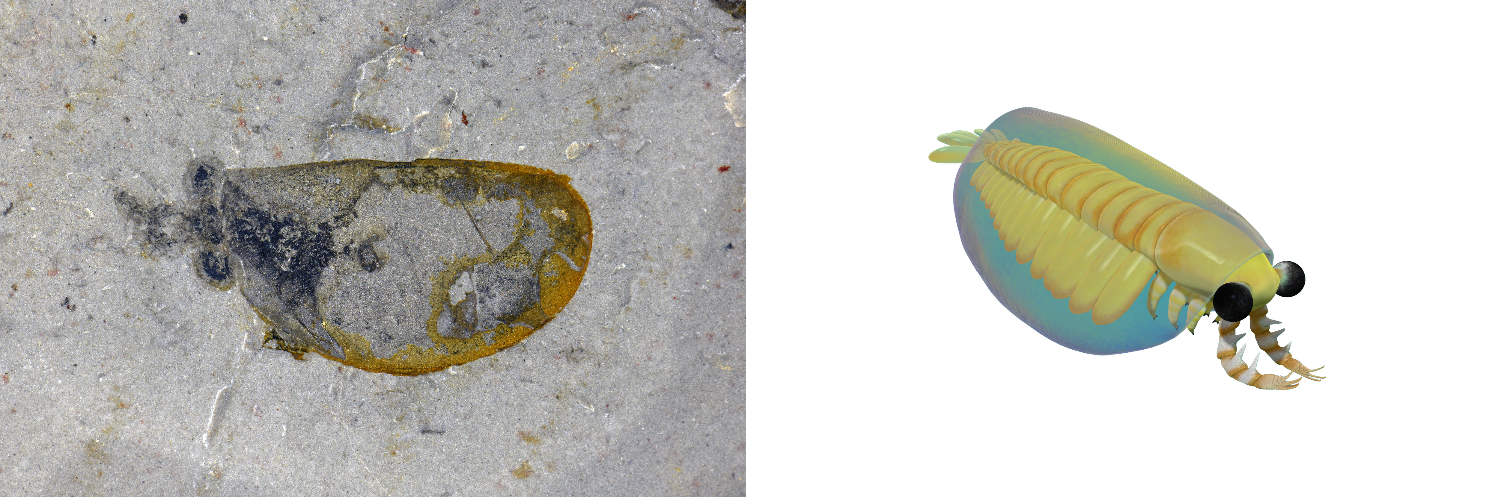 花垣生物群射齿类节肢动物-赫德虾类化石图(左)和复原图。新华社发