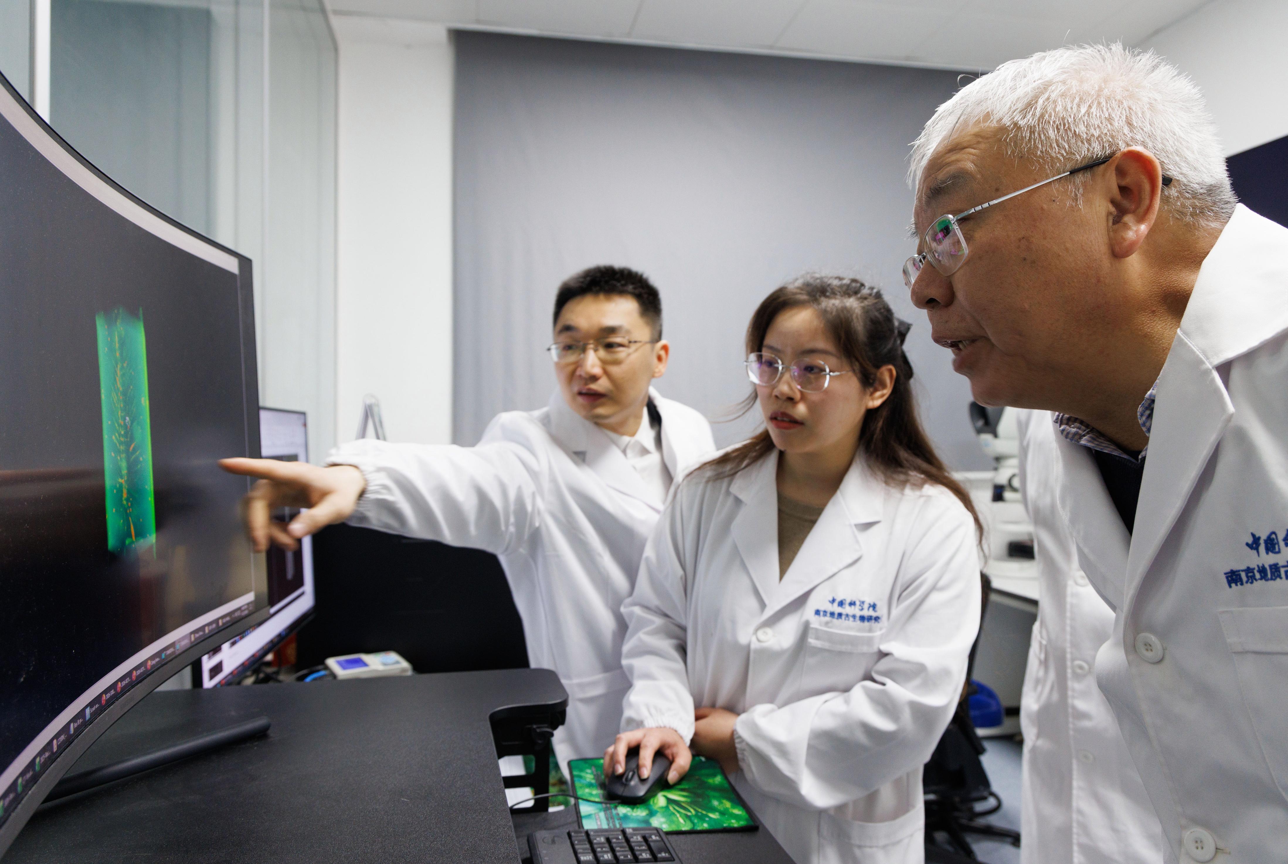 1月22日,在中国科学院南京地质古生物研究所拉曼-场发射联用扫描电镜实验室,中国科学院院士、研究员朱茂炎(后),研究员赵方臣(前),副研究员曾晗(中)在观察扫描电镜扫描的化石图。新华社记者 金立旺 摄