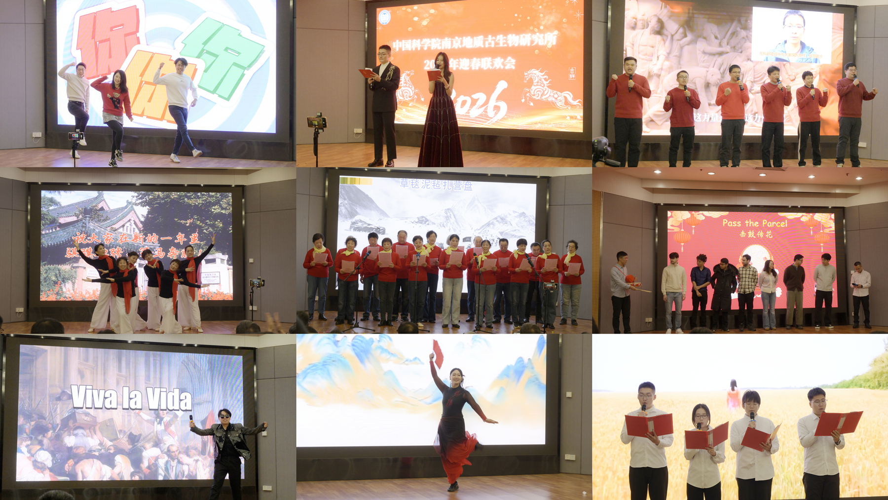 联欢会以2025年新职工带来的舞蹈《你要跳舞吗》中活力开场,动感舞姿展现了新生代科研工作者昂扬向上的精神风貌。整场文艺表演精彩纷呈、意蕴深厚:独唱《Viva La Vida》婉转激昂,经典舞蹈《珊瑚颂》柔美雅致,诗朗诵《诗意中国》饱含深情,古风舞蹈《寄明月》韵味悠长;退休职工带来的合唱《祖国 慈祥的母亲》与《过雪山草地》,字字句句承载着家国情怀与岁月坚守,彰显了南京古生物所老中青三代的薪火相传的精神底色。趣味十足的国际合作者互动游戏,传递出研究所开放包容的国际视野;穿插其间的抽奖环节惊喜不断,一次次将现场气氛推向高潮。最后,联欢会在合唱《团结就是力量》的激昂歌声中落下帷幕,歌声凝聚起全所职工协同攻关、勇毅向前的信念与决心。
